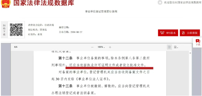 中央编办发[2014]4号《事业单位登记管理暂行条例实施细则》第二十八条:事业单位业务范围涉及国家实行资质认可管理或者执业许可管理的业务事项,须取得有关部门的资质认可或者执业许可后,方可申请登记;对已经取得相关资质认可或者执业许可的事业单位,核准登记的相关业务事项不得超出资质认可或者执业许可的范围。